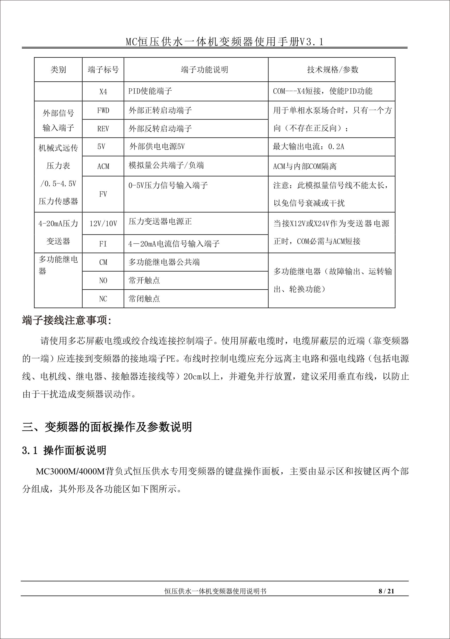MC恒壓供水一體機變頻器使用手冊V31-181205